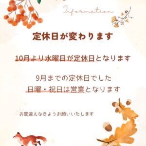 尚、定休日は毎週 水曜日 になりますのでお間違えのないようお願い致します。